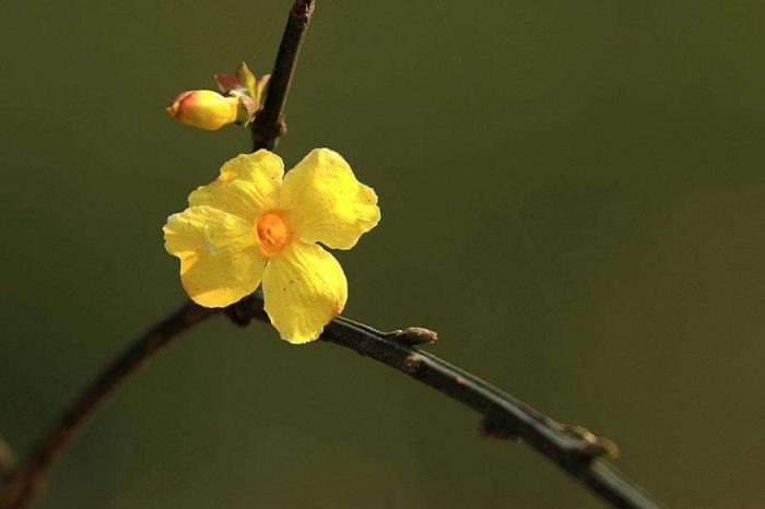 “金英翠萼带春寒,黄色花中有几般。”寒冬快要过去,春天就要来到了,金黄色的迎春花不畏风寒,迎风怒放,像是在诉说着春天的到来。