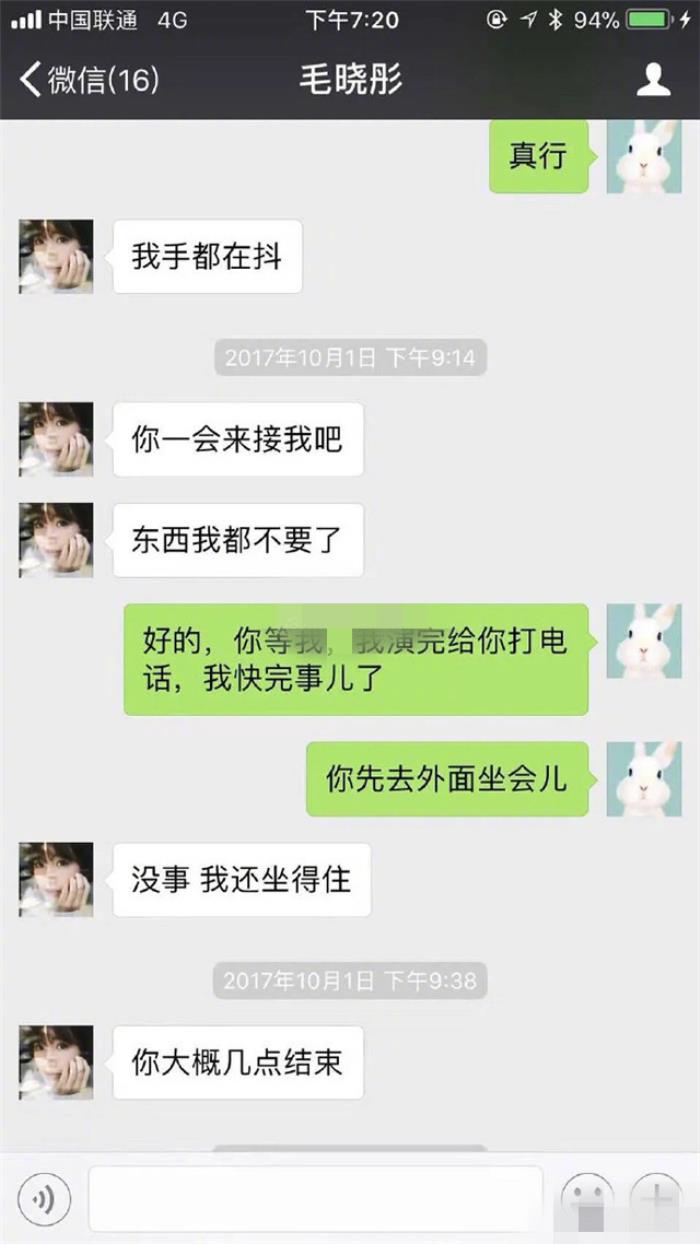 毛晓彤当时和好友的聊天记录,证实毛晓彤什么东西都没拿,直接走了。