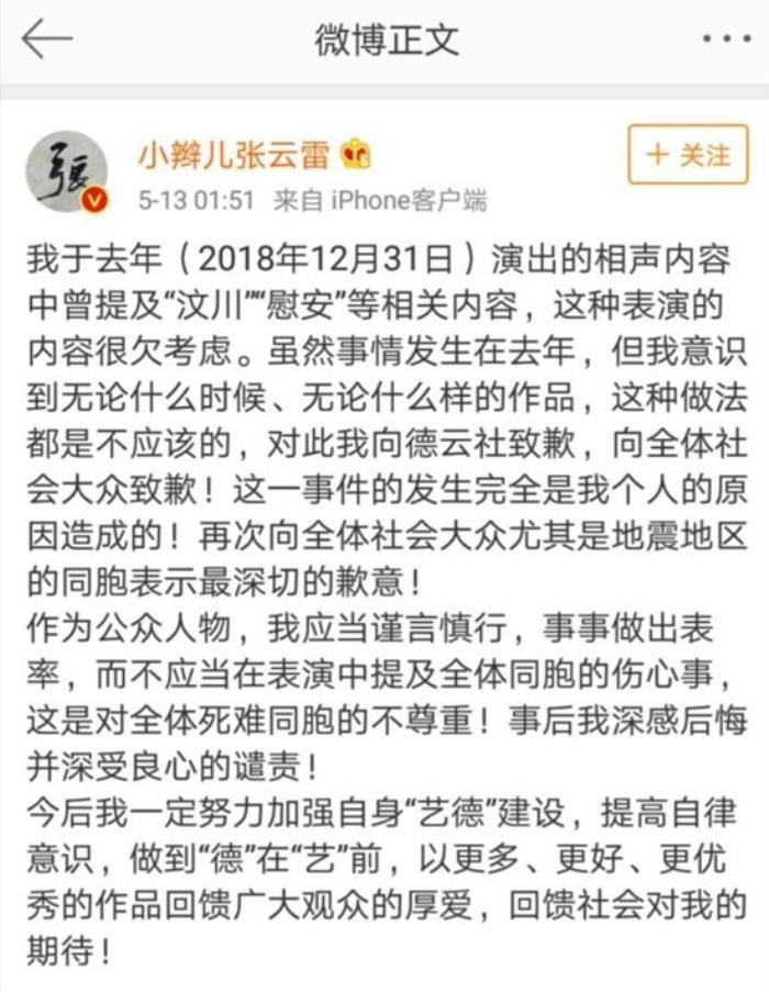 昨日是“512”汶川地震11年周年纪念日,网上热传一段张云雷拿汶川地震做逗梗的相声视频。视频中,德云社演员张云雷抖包袱称“大姐嫁唐山,二姐嫁汶川,三姐嫁玉树,我仨姐姐多有造化啊”,引起网友极大不适。13日凌晨,张云雷发微博向观众和德云社道歉,字里行间可见其诚恳态度。
