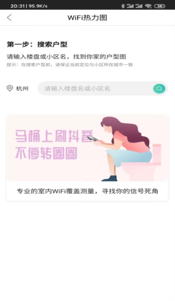 一键测速和wifi热力图两个功能和家庭网络测速有关,先进入wifi热力图看看。点击进入wifi热力图首先选择所在城市和小区。