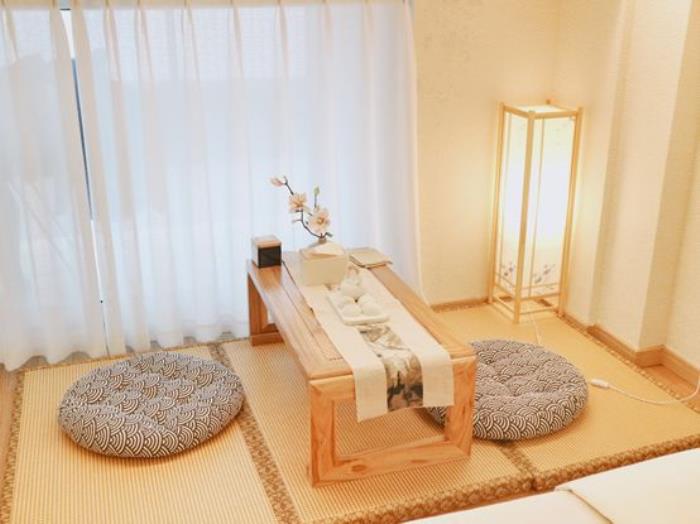 包房的陈设也很日系,都是让人感觉非常舒服的色调和氛围,房间内还设有日式榻榻米。这个喝茶区是专门为一些做完美容可以喝喝茶、吃甜品,由此放松的客人准备。