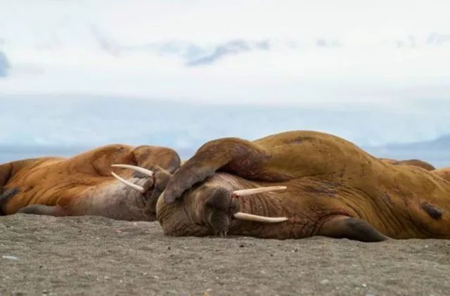 海象是有名的瞌睡王,上岸后经常倒下,身体睡得很香。 栖息地太小的话,即使变成两三层,依然睡得很甜。